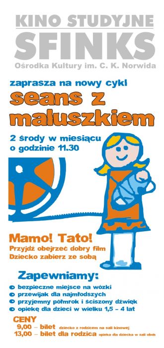 Podczas cyklu SEANS Z MALUSZKIEM proponujemy wspólne, dopołudniowe projekcje dobrych filmów, na które zapraszamy rodziców wraz z dziećmi gwarantując szczególnie dobrany repertuar (kino o wysokich walorach zdjęciowych i muzycznych, bez scen przemocy), zaplecze organizacyjne przyjazne rodzicom (przewijak dla najmłodszych, bezpieczne miejsce na wózki oraz możliwość pozostawienia dzieci w wieku 1.5 - 4 lat pod opieką w pomieszczeniach obok kina) a także przyjemny półmrok na sali kinowej i ściszony dźwięk dla tych rodziców, którzy zechcą oglądnąć film w towarzystwie swojej pociechy. Spotkania odbywają się w Kinie Sfinks dwa razy w miesiącu, w godzinach dopołudniowych.