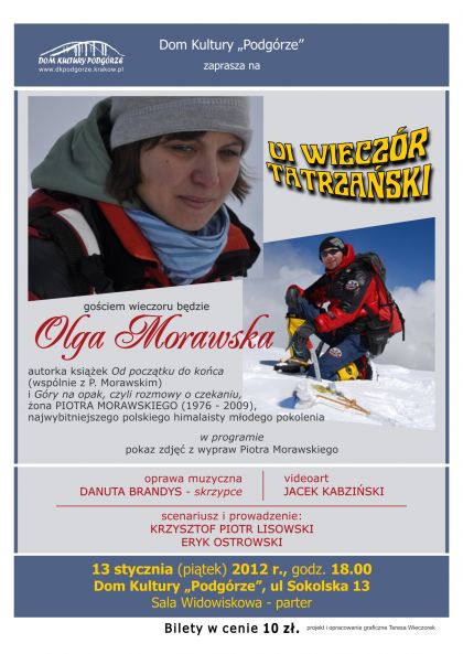 W ramach Podgórskiej Sceny Poezji gościem wieczoru będzie Olga Morawska autorka książek : Od początku do końca (wspólnie z P. Morawskim) i Góry na opak, czyli rozmowy o czekaniu, żona Piotra Morawskiego (1976 – 2009), polskiego himalaisty młodego pokolenia.