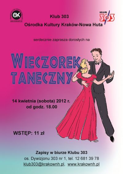 Klub 303 Ośrodka Kultury Kraków-Nowa Huta (os. Dywizjonu 303) zaprasza 14 kwietnia 2012 r. (sobota) o godz. 18.00 na wieczorek taneczny przy muzyce mechanicznej.