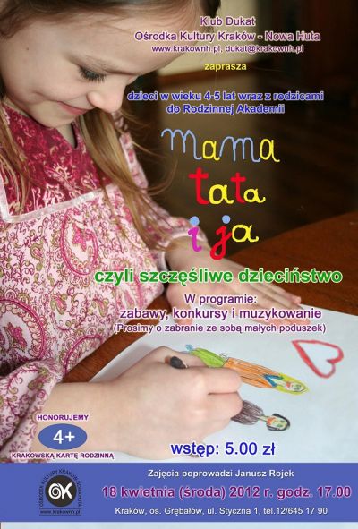 Klub Dukat Ośrodka Kultury Kraków-Nowa Huta (ul. Styczna 1) zaprasza rodziców z dziećmi w wieku 4-5 lat na drugie spotkanie w ramach Rodzinnej Akademii.
