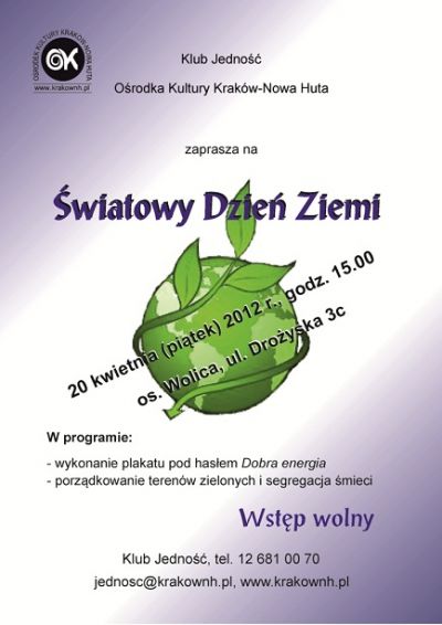 W tym roku Światowy Dzień Ziemi będziemy w Polsce obchodzić pod hasłem Dobra energia dla wszystkich. W promowanie postaw i działań proekologicznych włącza się Klub Jedność Ośrodka Kultury Kraków-Nowa Huta poprzez organizację festynu ekologicznego. W programie imprezy m.in.: wykonywanie plakatów promujących ochronę przyrody i naturalnego środowiska oraz porządkowanie terenów zielonych i segregacja śmieci.