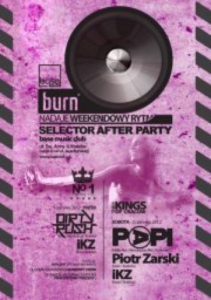 Szukasz imprezy, która tchnie w Ciebie energię i sprawi, że będziesz się świetnie bawił przez całą noc? W nocy 1 i 2 czerwca, base music club i marka BURN przygotowała wydarzenie, które tętni najlepszą muzyką i świetną atmosferą. Selector after party będzie nocą spod znaku rnb i house. Na pierwszym parkiecie zagra dobrze Wam znany Ikz. Natomiast parkiet house w pierwszą noc zachwyci dźwiękami Dirty Rush, a w drugą Papi i Piotr Zarski.