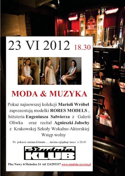 Pokaz najnowszej kolekcji Marioli Wróbel zaprezentują modelki RORES MODELS , biżuteria Eugeniusza Salwierza z Galerii Oliwka oraz recital Agnieszki Jałochy z Krakowskej Szkoły Wokalno-Aktorskiej Wstęp wolny