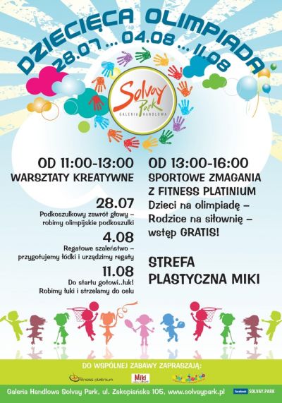 Przed nami Letnie Igrzyska Olimpijskie w Londynie i kolejne sportowe emocje. Z myślą o najmłodszy Galeria Handlowa Solvay Park wraz z Fitness Platinium oraz Salonem Zabawek Miki zaprasza na trzy weekendy olimpijskich zmagań i doskonałej zabawy. Do zobaczenia 28 lipca; 4 i 11 sierpnia, w godzinach od 11.00 do 16.00 podczas Dziecięcej Olimpiady w Solvay Park. Wstęp wolny.