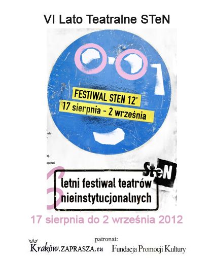 Stowarzyszenie Teatrów Nieinstytucjonalnych STeN ma przyjemność zaprosić na 6. Letni Festiwal Teatrów Nieinstytucjonalnych STeN 2012, który to odbędzie się w Krakowie od 17 sierpnia do 2 września. Szczegółowy program poniżej oraz na stronie: http://www.stenkrakow.pl