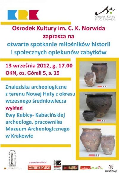 Zapraszamy do Ośrodka Kultury im. C.K.Norwida, os. Górali 5, na spotkanie pt. „Znaleziska archeologiczne z terenu Nowej Huty z okresu wczesnego średniowiecza”.