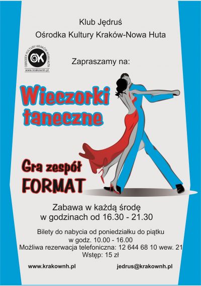 Klub Jędruś Ośrodka Kultury Kraków-Nowa Huta (os. Centrum A 6a) zaprasza dorosłych na zabawy taneczne przy muzyce na żywo.