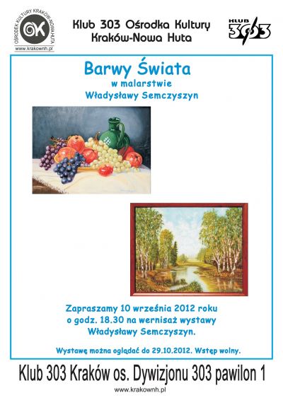 Tym razem prezentowana będzie twórczość Władysławy Semczyszyn. Autorka, która z wykształcenia jest chemikiem, swoje zainteresowanie sztuką zgłębiała na zajęciach w Akademii III Wieku. W jej obrazach dominującym motywem są pejzaże, kwiaty i martwa natura.