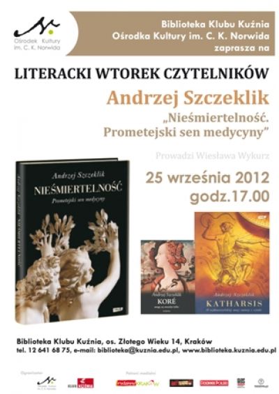 Spotkanie będzie dotyczyć głównie pośmiertnie wydanego dzieła Andrzeja Szczeklika zatytułowanego przez Autora Nieśmiertelność. Wrócimy również do poprzednich książek tego wielkiego erudyty – Kore. O chorych, chorobach i poszukiwaniu duszy oraz Katharsis