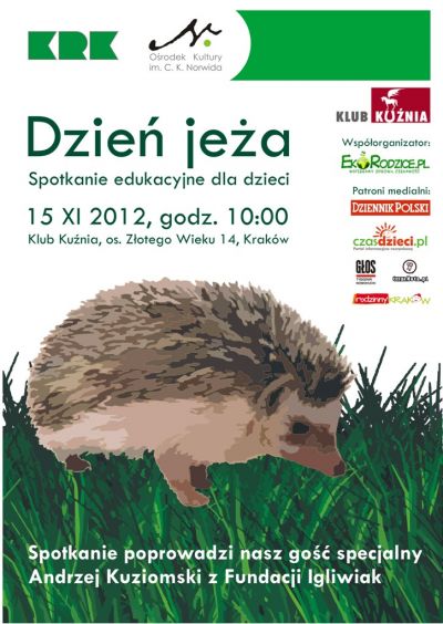 10 listopada świętowaliśmy Dzień Jeża. Z tej okazji Klub Kuźnia Ośrodka Kultury im. C.K. Norwida oraz portal Ekorodzice.pl zapraszają amatorów kolczastych zwierzątek na spotkanie edukacyjne, które poprowadzi nasz gość specjalny Andrzej Kuziomski z Fundacji Igliwiak.