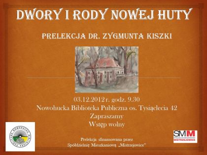 Nowohucka Biblioteka Publiczna w Krakowie i Spółdzielnia Mieszkaniowa "Mistrzejowice" zapraszają na prelekcję dr. Kazimierza Kiszki, który bardzo interesująco będzie opowiadał o rodach ziemiańskich Nowej Huty.