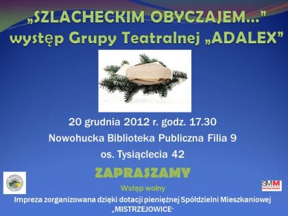 Biblioteka zaprasza czytelnikw, czonkw Podgrskiego Stowarzyszenia Przyjaci Sztuk Wszelkich oraz sympatykw na spotkanie organizowane z okazji wit Boego Narodzenia. Gociem specjalnym bdzie Pani Teresa Zaremba - Radna Dzielnicy XVI, ktra uwietni spotkanie piewem kold i gr na gitarze. Bdzie te akompaniowaa w czasie wsplnego piewu kold.(...)  ... więcej »