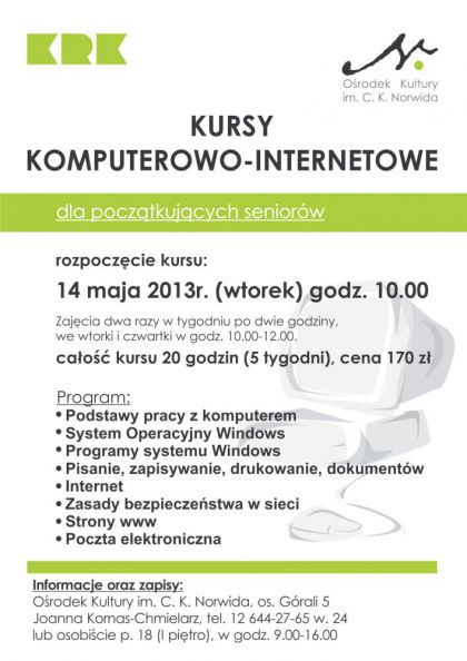 Zapraszamy wszystkich Aktywnych - wiekiem intensywnych na otwarte kursy komputerowe dla pocztkujcych. Zapewniamy przyjemn, bezstresow atmosfer, cierpliwych prowadzcych i znakomite efekty!