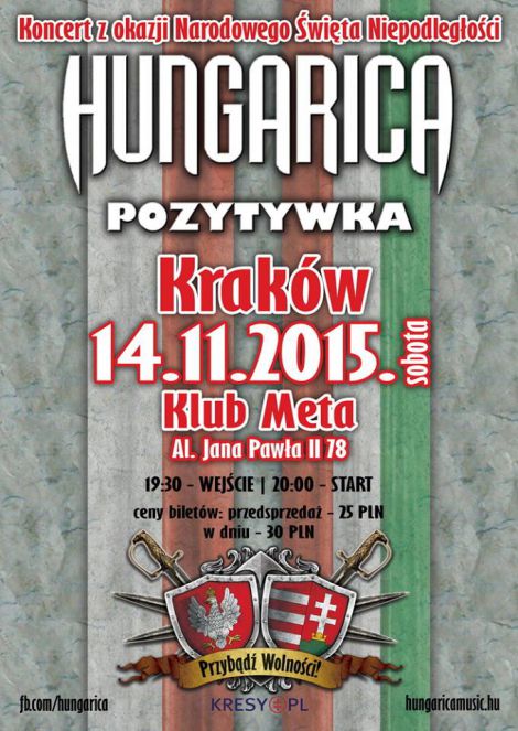 | 14 listopada odbdzie si w Krakowie koncert wgierskiego zespou Hungarica, jednego z najbardziej znanych zespow rockowych na Wgrzech, ktry propaguje przyja polsko-wgiersk, a ostatnio nagra pyt z utworami w jzyku polskim z udziaem polskich wykonawcw sceny rockowej, m.in. Andrzejem Nowakiem (TSA). Zesp zaproszony zosta na wystpy w Polsce z okazji naszego Narodowego wita i wystpi w Warszawie, widniku, rodzie l(...) ... więcej » |