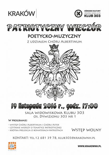 | Klub 303 Orodka Kultury Krakw-Nowa Huta oraz Koo Seniora nr 25 Polskiego Zwizku Emerytw Rencistw i Inwalidw zapraszaj seniorw na spotkanie ktre odbdzie si 19 listopada o godz. 17:00 na os. Dywizjonu 303 nr 1, z okazji wita 11 Listopada. Podczas imprezy zaprezentuj si dwa chry: Chr Albertinum i Chr Aster. Odbdzie si take czytanie wierszy o tematyce patriotycznej autorstwa Pana Ryszarda Wiszniewskiego oraz krtka prelekcja na (...) ... więcej » |