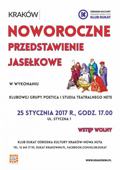 | Klub Dukat Orodka Kultury Krakw-Nowa Huta (ul. Styczna 1) zaprasza wszystkich mieszkacw Grbaowa i okolicznych osiedli na midzypokoleniowy spektakl w wykonaniu Klubowej Grupy Poetica oraz Studia Teatralnego NETE. 25 stycznia o godz. 17.00 na scenie przybliona zostanie historia Boego Narodzenia z przymrueniem oka - przedstawienie nawizuje do tradycji jasekowej. Po przedstawieniu aktorzy opowiedz uczestnikom (szczeglnie dzieciom) o tym(...) ... więcej » |