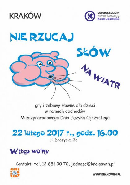 Z okazji Midzynarodowego Dnia Jzyka Ojczystego, Klub Jedno Orodka Kultury Krakw-Nowa Huta (ul. Droyska 3c) zaprasza 22 lutego o godz. 16.00 na spotkanie dla dzieci Nie rzucaj sw na wiatr. W programie znajd si potyczki jzykowe, gry i zabawy sowne, kalambury oparte na polskich przysowiach.