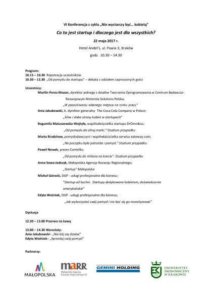 Kiedy pracowalimy nad tematem VI Konferencji Nie wystarczy by kobiet i pada propozycja, by powici j startupom, nasze zdania byy podzielone. Bo czym jest startup? Biznesem ze sformalizowan struktur? Pomysem na biznes? Wykorzystaniem luki na rynku? Odpowiadajcym na potrzeby wiatowych trendw pomysem na realizacj marze? A moe zwyczajnie mod? Definicji startupw jest oczywicie(...) ... więcej » |