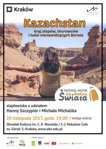 Zapraszamy do Orodka Kultury im. C. K. Norwida, C-2 poudnie Cafe, na slajdowisko Hanny Szczypir i Michaa Michalika p.n. Kazachstan - kraj stepw, biurowcw i ludzi nienawidzcych Borata.