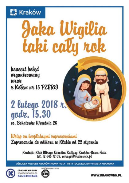 Wsplne koldowanie to pikna polska tradycja. By nie zapomnie o tej tradycji zapraszamy na koncert kold w wykonaniu zaprzyjanionego Koa nr 15 Polskiego Zwizku Emerytw Rencistw i Inwalidw w Klubie Mirage Orodka Kultury Krakw-Nowa Huta (os. Bohaterw Wrzenia 26) w pitek 2 lutego o godz. 15.30. Usyszymy najpikniejsze polskie koldy i pastoraki, ktre sprawi, e powrcimy jeszcze na chwil w magiczny klimat wit Boego Narodzenia.