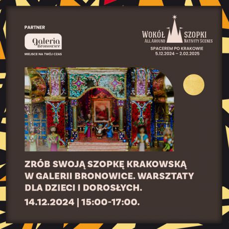 W sobotę, 14 grudnia, miłośnicy kreatywnego spędzania czasu będą mogli wziąć udział w warsztatach dla rodzin. Zajęcia z tworzenia krakowskich szopek poprowadzą przedstawiciele Krakowskiego Biura Festiwalowego w ramach projektu „Wokół Szopki”, którego partnerem od kilku lat jest Galeria Bronowice. Podczas wydarzenia dzieci oraz ich opiekunowie poznają wielowiekową historię krakowskich szopek, dowiedzą się, co inspirowało ich twórców, a przede wszystkim samodzielnie wykonają własną dekorację. Do dyspozycji uczestników będą niezbędne materiały oraz ozdoby. Gotowe prace chętni zabiorą ze sobą do domów.