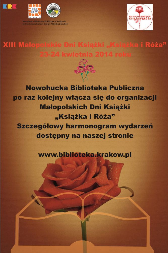 Nowohucka Biblioteka Publiczna w Krakowie włšczyła się w organizację tegorocznej edycji Małopolskich Dni Ksišżki Ksišżka i Róża. W dniach 23-24 kwietnia 2014 r. zaplanowano wiele wydarzeń, które będš promowały czytelnictwo, nowoci wydawnicze i autorów ksišżek. Będš to m. in.: wystawy, spotkania Dyskusyjnego Klubu Ksišżki, przeglšdy nowoci wydawniczych, zajęcia literacko edukacyjne i literacko plastyczne dla dzieci oraz plebiscyt czytelniczy. Ponadto w cyklu: 365 i jeden dzień dookoła ksišżki czytelnicy będš mogli wymieniać się ksišżkami. Podczas spotkania pn. Literackie nowoci spod Wawelu Dyrektor Działu Promocji Wydawnictwa Literackiego zaprezentuje nowoci wydawnicze tej zasłużonej oficyny. W cyklu: Akademia rozwoju wyobrani na zajęciach pt. Godzina pšsowej róży prezentowana będzie szeroka gama botanicznych tytułów ksišżek zachęcajšcych dzieci do czytania na łonie natury. Odbędzie się też plebiscyt czytelniczy w dwóch kategoriach: dla dorosłych pn. Ksišżka mojego dzieciństwa oraz dla dzieci pn. Moja ulubiona ksišżka. Plebiscyt zakończy się wystawš ulubionych ksišżek wraz z informacjš o ich autorach.