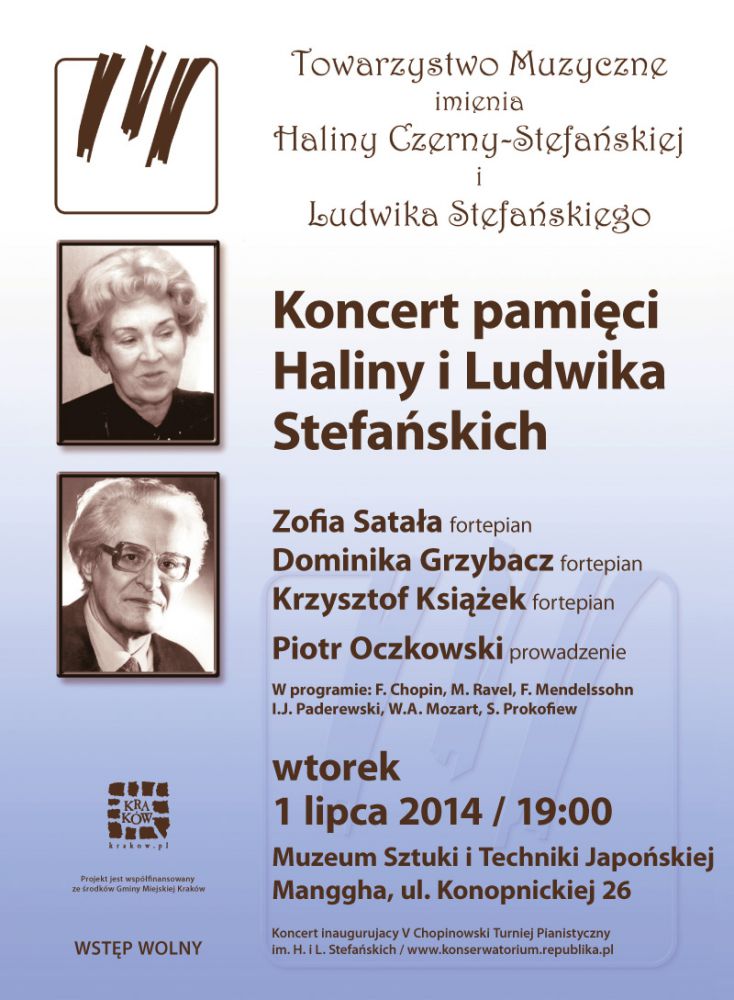 We wtorek 1 lipca 2014 o godz. 19:00 Muzeum Sztuki i Techniki Japońskiej Manggha wypełni muzyka fortepianowa F. Chopina, M. Ravela, F. Mendelssohna, I.J. Paderewskiego, W.A. Mozarta oraz S. Prokofiewa. W koncercie, którego inicjatorem jest wiatowej sławy klawesynistka prof. Elżbieta Stefańska, a organizatorem Towarzystwo Muzyczne im. Haliny Czerny-Stefańskiej i Ludwika Stefańskiego, wystšpiš młodzi adepci sztuki: