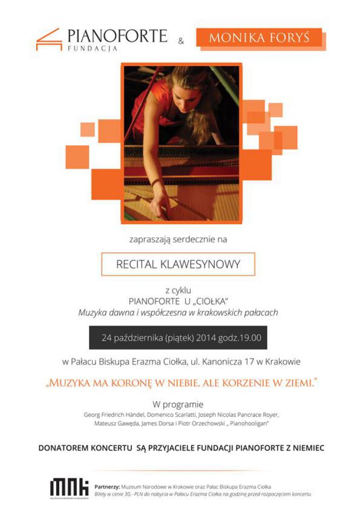 MONIKA FORY - absolwentka krakowskiej Akademii Muzycznej w klasie klawesynu prof. Elżbiety Stefańskiej. Swoje umiejętnoci doskonaliła na licznych kursach mistrzowskich dotyczšcych wykonawstwa muzyki dawnej prowadzonych przez Władysława Kłosiewicza, Ketila Haugsanda, Christie Schornsheim, Bernharda Klaprotta, Jacquesa Ogga czy Marka Krolla, poszerzajšc swoje umiejętnoci o kursy klawikordu u Marii Erdman i pianoforte u Katarzyny Drogosz. Monika brała również udział w kursach klawesynowej muzyki współczesnej prowadzonych przez Elżbietę Chojnackš. Artystkę interesuje muzyka klawesynowa XX wieku, ale także ta najnowsza. Monika chętnie eksperymentuje z łšczeniem klawesynu z innymi instrumentami czy też z muzykš elektronicznš. Współpracujšc z Piotrem Orzechowskim (Pianohooligan) dokonała prawykonania jego utworu na klawesyn solo pt. Trans-Toccata podczas finału międzynarodowego konkursu Prix Annelie de Man w ramach November Festiwal w Holandii w 2012 roku. W 2013 roku dokonała kolejnego prawykonania tym razem utworu pianisty jazzowego i kompozytora Mateusza Gawędy pt. Little Traveler na klawesyn solo, nonet smyczkowy oraz fortepian. W grudniu tego samego roku zdobyła III miejsce i nagrodę specjalnš za najciekawsze wykonanie utworu C. Ph. E. Bacha na III Akademickim Konkursie Klawesynowym. Klawesynistka wystšpiła podczas takich wydarzeń jak: Festiwal Bach Biennale Weimar (Niemcy), De Bach a Mozart (Francja), Festiwal Wandy Landowskiej czy Dni Bachowskie (Kraków), VI Letnia Akademia Muzyki Dawnej ( również jako wykładowca, AM Poznań), XII Dni Muzyki Dawnej (Bydgoszcz), XXIV Międzynarodowy Festiwal Młodych Laureatów Konkursów Muzycznych (Katowice). Współpracowała z takimi wykonawcami i dyrygentami jak: Andrzej Białko, Zbigniew Pilch, Wiesław Delimat, Paweł Przytocki, Monika Bachowska.