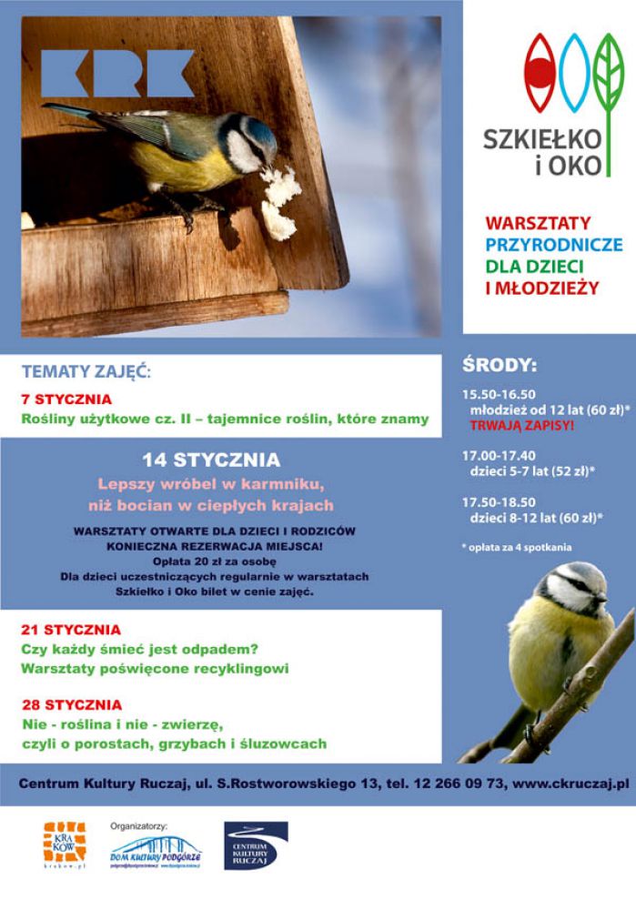 Częć zwierzaków przesypia zimę, częć odlatuje do cieplejszych krajów, ale częć zostaje, między innymi w naszych ogródkach i parkach. Czy sikora poradzi sobie w mrone dni? Czy mogę jš nakarmić? I czy tym samym mogę nakarmić kosa albo dzięcioła? Na zajęciach dzieci poznajš najczęstszych goci karmników. Dowiedzš się także, kiedy i czym dokarmiać ptaki i przygotujš własnš kulę tłuszczowš dla ptaków.