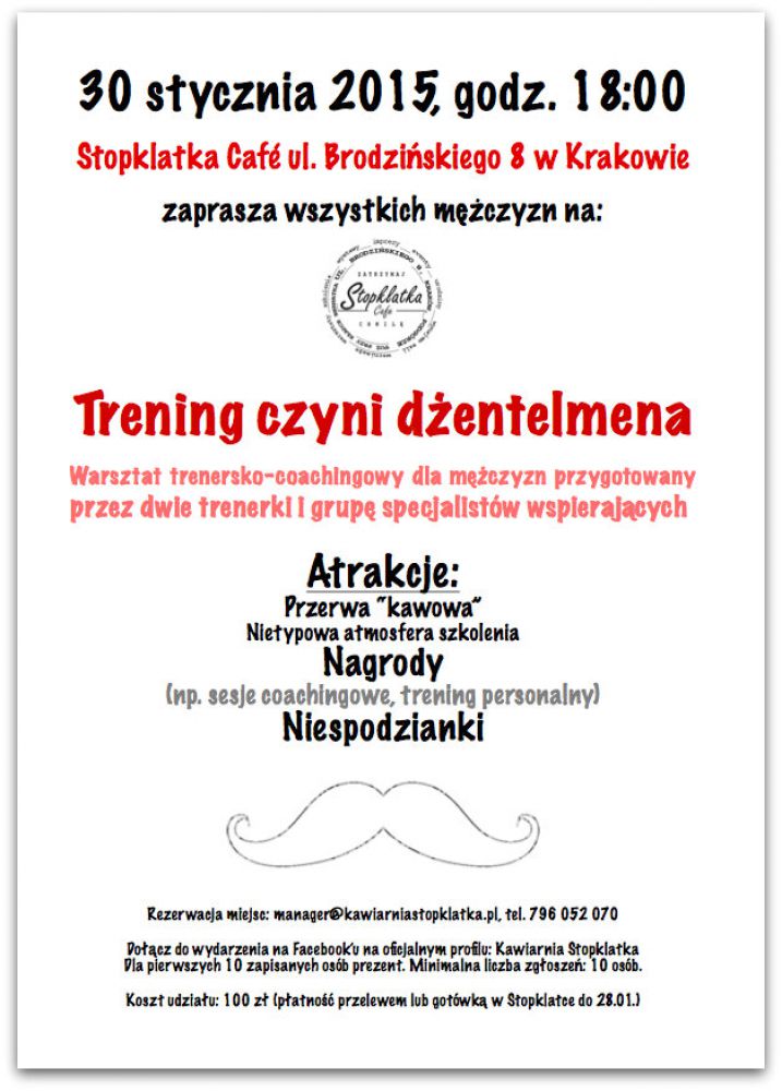 Po takim warsztacie odkryjesz, jak zwiększyć swojš atrakcyjnoć w oczach kobiet i być dżentelmenem we współczesnym wiecie. Dowiesz się czego nie wiesz, że nie wiesz, poznasz lepiej siebie i swoje możliwoci. Będzie też co o wyglšdzie, co o zachowaniu, co o głosie