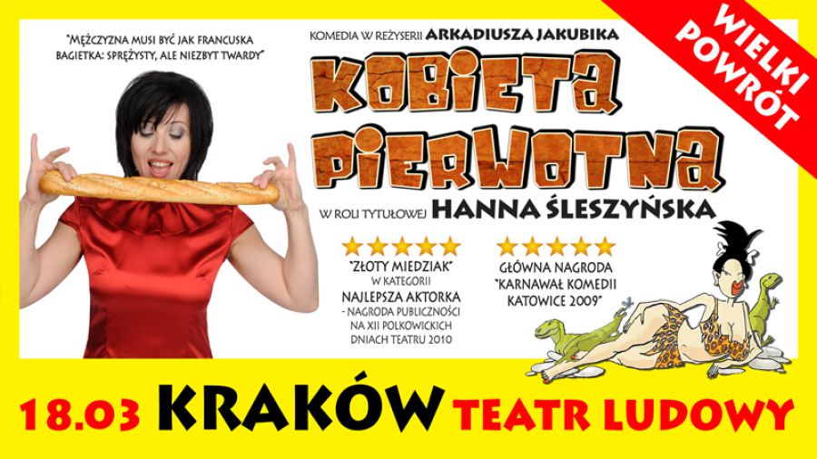 Serdecznie zapraszamy na Kobietę Pierwotnš 18 marca 2015 do Teatru Ludowego w Krakowie! Gwarantujemy poprawę humoru i zapadajšcš na długie lata lekcję o damsko-męskich relacjach!