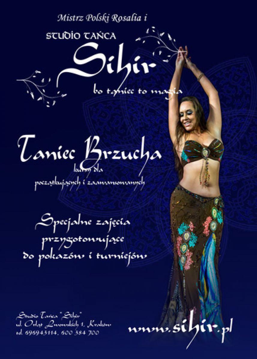 Studio Tańca Sihir serdecznie zaprasza na nowy kurs tańca brzucha dla poczštkujšcych. Kurs odbywać się będzie regularnie o 19.00 w czwartki. Kurs obejmuje naukę podstawowych figur belly dance, kobiecych ozdobników, oraz paru podstawowych rytmów. Kurs kończy się naukš profesjonalnej choreografii. Uczestniczki mogš otrzymać certyfikaty potwierdzajšce odbycie kursu. Możliwoć kontynuacji nauki na kolejnych poziomach zaawansowania.