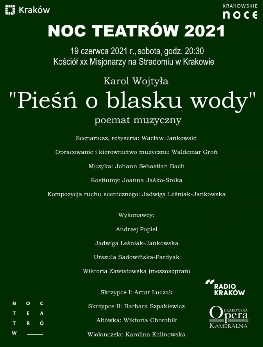 Bezpłatne wejœciówki na poemat muzyczny „Pieœń o blasku wody” będš do odbioru 15 i 16 czerwca 2021 w godzinach 10:00-14:00 w siedzibie Krakowskiej Opery Kameralnej. Serdecznie zapraszamy!
