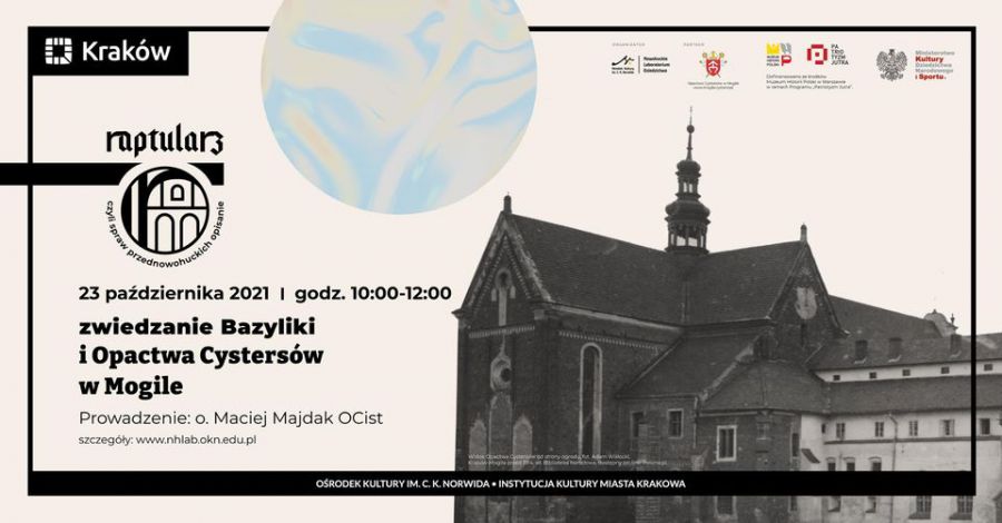 Zwiedzanie Opactwa Cystersów w Mogile, jednego z najstarszych opactw polskich. Zobaczymy m.in. gotyckš częœć opactwa z renesansowymi freskami Stanisława Samostrzelnika, kapitularz oraz refektarz, wirydarz z zegarem słonecznym. Posłuchamy opowieœci o historii opactwa, duchowoœci cysterskiej, najważniejszych zbiorach sztuki sakralnej. Potem przejdziemy do Bazyliki Krzyża œwiętego, gdzie zobaczymy Retabulum ze Œcinawy oraz cudowny Krzyż Mogilski. Prowadzenie: o. Maciej Majdak OCist. Wydarzenie jest częœciš finisażu wystawy „Raptularz, czyli spraw przednowohuckich opisanie”.