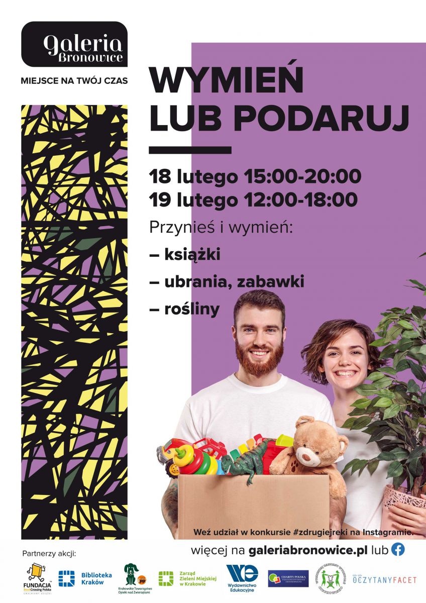 Wystarczy wzišć udział w akcji Wymień lub podaruj i w dniach 18-19 lutego przynieć do Galerii Bronowice niepotrzebnš już odzież, zabawki, ksišżki czy roliny. Wydarzenie odbędzie się w pištek w godz. 15:00 20:00, a także w sobotę w godz. 12:00 18:00 na parterze centrum handlowego. Za każdš przyniesionš rzecz otrzymamy żeton uprawniajšcy do wymiany na innš, znajdujšcš się w przestrzeni stoisk wymiany. Pamiętajmy, żeby przyniesione rzeczy były czyste, niezniszczone - takie, które sami chętnie zabralibymy do domu.
