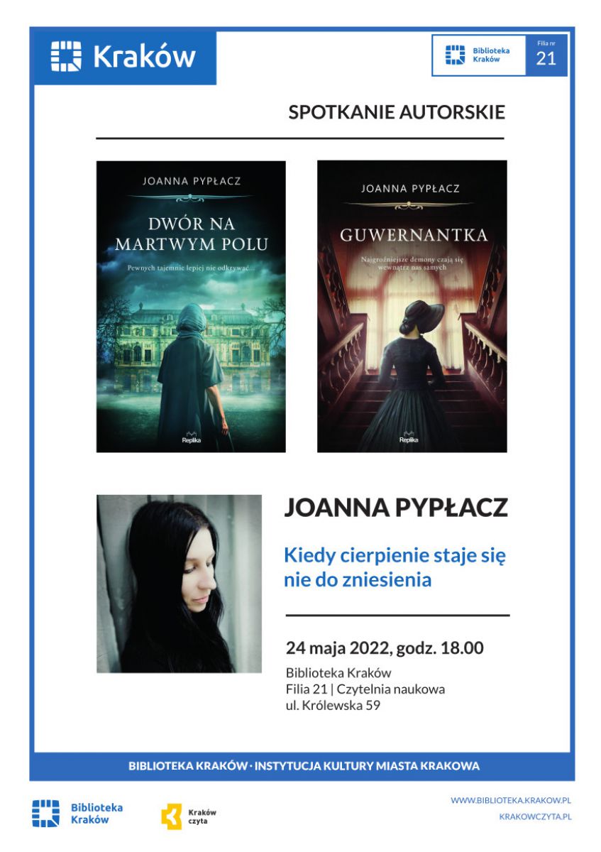 Joanna Pypłacz urodziła się w Krakowie 14 listopada 1982. Z wykształcenia doktor habilitowany filologii klasycznej, z zamiłowania pasjonatka literatury grozy, fotografii i muzyki poważnej, na co dzień pracuje w Bibliotece Jagiellońskiej. Jest autorkš licznych prac naukowych, artystycznych przekładów poezji łacińskiej, a także powieci pt. August Nacht, Krzyk Persefony, Mechaniczna ćma, Nierozdzielne oraz Podziemia", Dwór na martwym polu, Guwernantka. Jej ulubione epoki to XVIII i XIX wiek. Oprócz pisania opowiadań i wierszy, gra również na pianinie. Zapraszamy na spotkanie.
