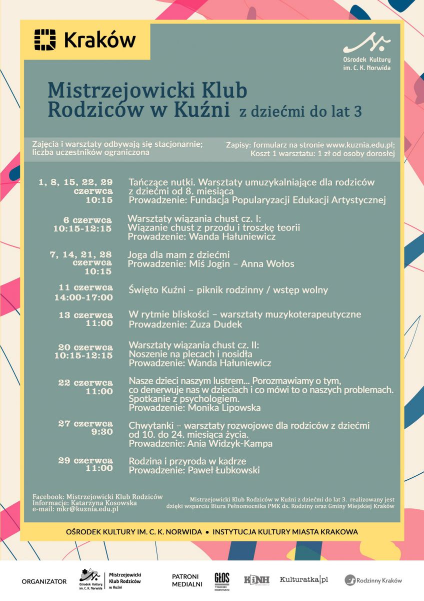 Na zajęcia obowišzujš zapisy przez formularz dostępny od 27 V, od godz. 11.00 na stronie www.kuznia.edu.pl w zakładce Mistrzejowicki Klub Rodziców.