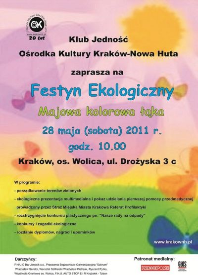 Klub Jednoœć Oœrodka Kultury Kraków – Nowa Huta zaprasza 28 maja (sobota) 2011 r. o godz. 10.00 na Festyn ekologiczny - Majowa kolorowa łška.
