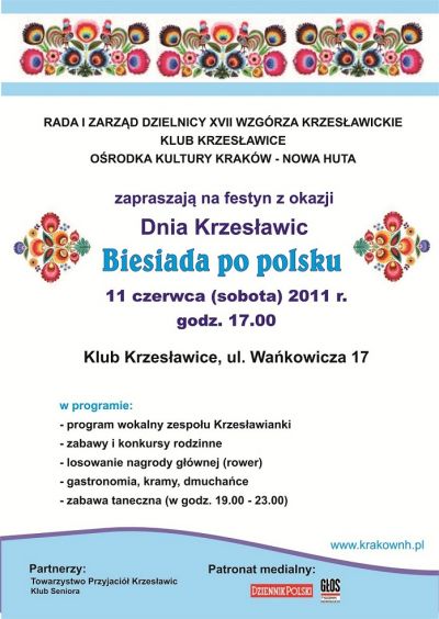 Orodek Kultury Kraków-Nowa Huta oraz Rada i Zarzšd Dzielnicy XVII Wzgórza Krzesławickie zapraszajš mieszkańców Krzesławic i okolic na festyn rodzinny Dzień Krzesławic Biesiada po polsku.