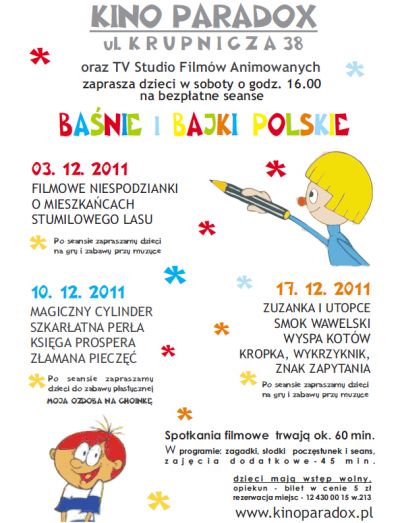 Spotkania filmowe trwajš około 60 minut, w programie zagadki, słodki poczęstunek i seans, zajęcia dodatkowe 45 min.