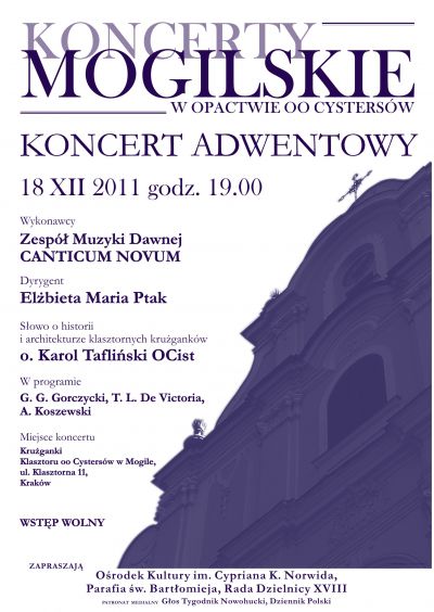 Koncert odbędzie się w XIV-wiecznych, gotyckich krużgankach Klasztoru oo Cystersów. Ich sklepienia pokryte pokryte sš renesansowymi freskami Stanisława Samostrzelnika- cystersa mogilskiego, który był mistrzem szkoły iluminatorów. Swoje pracę wykonywał głównie dla osób zwišzanych z dworem króla Zygmunta Starego. Uprawiał też malarstwo sztalugowe, wykonywał polichromie. O krużgankach, S. Samostrzelniku będzie mówił O. Karol Tafliński.