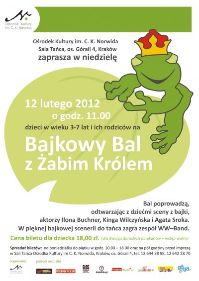 Cena biletu dla dziecka 18,00 zł. ( dla dwojga dorosłych opiekunów wstęp wolny). Sprzedaż biletów od poniedziałku do pištku w godzinach 10.00 – 18.00 w Sali Tańca Oœrodka Kultury im. C. K. Norwida, os. Górali 4, Kraków, tel. 12-644-38-98, 12-642-28-70.