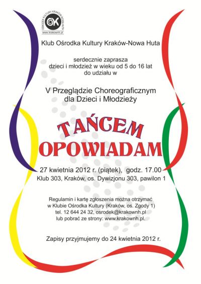 Klub Orodka Kultury zaprasza do udziału w V Przeglšdzie Choreograficznym dla Dzieci i Młodzieży. Zgłoszenia przyjmowane będš do 24 kwietnia 2012 r.