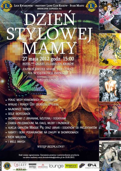 Podczas imprezy przewidywany jest wykład p. Moniki Jurczyk OSY osobistej stylistki na temat dopasowania ubioru do sylwetki i stylu życia oraz wykład trenera z Centrum Terapii i Rozwoju Open Medical o nowej metodzie biofeedback stosowanej w psychologii i medycynie. Odbędzie się również pokaz mody zorganizowany przez krakowskich projektantów. Ponadto gocie będš mogli zakupić ubrania i dodatki w specjalnie przygotowanych showroomach korzystajšc z porad stylistek, które towarzyszyć im będš przez cały czas trwania imprezy. Fryzjerzy i gabinety SPA będš informować uczestników o najnowszych trendach i sposobach dbania o ciało. Przez cały czas trwania eventu podziwiać będzie można obrazy p. Małgorzaty Bieniek maggie piu.