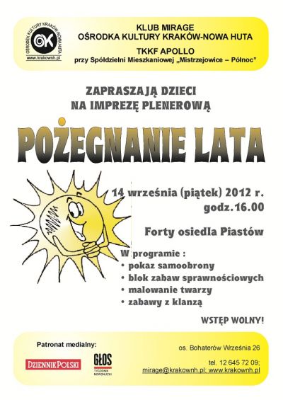 Klub Mirage Oœrodka Kultury Kraków-Nowa Huta zaprasza na imprezę sportowo – rekreacyjnš dla dzieci ze szkół podstawowych, z okazji zakończenia wakacji.