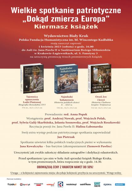 Wydawnictwo Biały Kruk i Polska Fundacja Humanistyczna im. bł. Wincentego Kadłubka mają zaszczyt zaprosić 1 kwietnia 2023 (sobota) o godz. 16.00 do Auli św. Jana Pawła II w Sanktuarium Bożego Miłosierdzia w Krakowie-Łagiewnikach, ul. S. Faustyny 3, na uroczystą promocję trzech premierowych książek w ramach spotkania pn. „Dokąd zmierza Europa”.