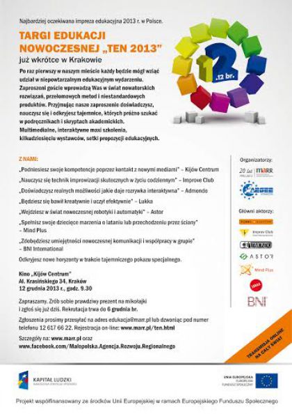 Targi Edukacji Nowoczesnej bd obejmoway dwa rwnolegle odbywajce si w tym samym miejscu i czasie wydarzenia. W pierwszym z nich nasi gocie bd mogli uczestniczy w tzw. Maxi szkoleniach, warsztatach, ktre realizowane bd przez wyselekcjonowane firmy reprezentujce nowoczesne, innowacyjne narzdzia, metody, rozwizania w zakresie edukacji. Druga cz, odbywajca si w holu kina umoliwia spotkanie i rozmow z firmami oraz rnego rodzaju jednostkami edukacyjnymi w praktyce wykorzystujcymi innowacyjne rozwizania w zakresie edukacji. Zaproszeni do udziau w wydarzeniu wystawcy rwnie bd w praktyczny sposb prezentowa swoje dowiadczenia. Edukacja poprzez dziaanie a nie wkuwanie to jedno z mott, ktre nam przywieca