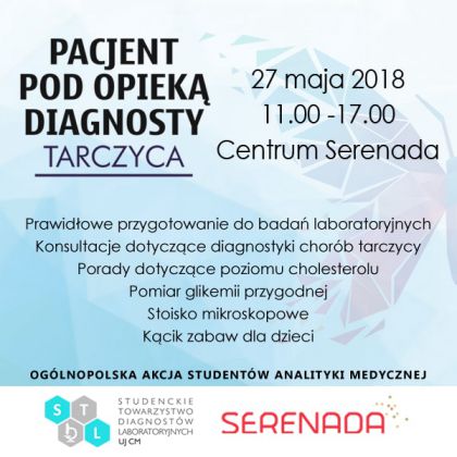 27 maja w Dzie Diagnosty Laboratoryjnego na terenie Centrum Serenada odbdzie si oglnopolska akcja profilaktyczna Pacjent pod opiek Diagnosty, ktra jest inicjatyw organizacji studenckich zrzeszajcych studentw Analityki Medycznej z caej Polski. W Krakowie za organizacj odpowiada Studenckie Towarzystwo Diagnostw Laboratoryjnych Collegium Medicum Uniwersytetu Jagielloskiego. Akcja ma na celu pokazanie kim jest i czym zajmuje si diagnosta laboratoryjny, atake zwrcenie uwagi na prawidowe przygotowanie do bada laboratoryjnych. Podczas wydarzenia bdzie mona zasign informacji dotyczcych tarczycy, wykonywania pomiaru glikemii, pozna dziaanie mikroskopu oraz spotka si z diagnostami. Akcja odbywa si w 11 najwikszych miastach w Polsce i jej partnerami s m.in. Krajowa Izba Diagnostw Laboratoryjnych, firma ALAB Laboratoria, firma Diagnostyka oraz firma Roche.